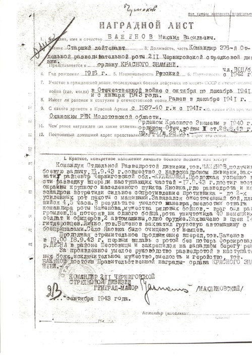 Баженов Михаил Васильевич1916 г. - 1943 г.Старший лейтенант 13 армии 211 Черниговской стрелковой дивизии, командир 376 отдельной развед. роты. Убит 04.10.1943 г. Белорусская ССР, Полесская обл., д. Гдень.